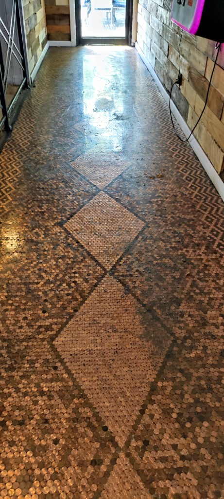 Șapcă a și fost (salutări Șapcă, se știe el!), iar situația nu ne-a împiedicat să începem ziua în forță: trecând râul Ohio în New Albany, Indiana (o oră mai devreme acolo, că tot vorbim de state). Am început astfel ziua glorios, la un bar cu podea de bani și burger de cămilă. Adică într-adevăr, “camel”, dromader etc. Cu speranța că nu a fost un truc de marketing, nefiind suficient de sofisticat ca să fac diferența între un burger de vită, unul de cămilă și unul de opossum, m-am bucurat de moment. În același timp am realizat însă că sunt suficient de sofisticat să recunosc banii, oriunde s-ar afla ei, un mare plus față de lipsa de competență în burgeri.