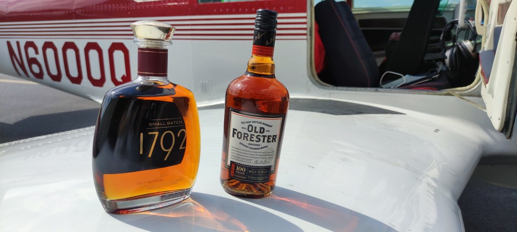 Revenind la Kentucky si la notorietatea lui, am ținut să punctez până la închiderea zilei cele 3 lucruri care îl fac celebru: 1) tutun, reușind să cumpăr, cash, în secundele de dinaintea închiderii magazinului, niște trabucuri, 2) KFC, de la care m-am abținut, dar însă cărora le-am admirat de afară frumusețe de stadion (nu e gluma, exista stadionul KFC oricât de ironic v-ar părea) și 3) bourbon-ul, Kentucky fiind DOC pentru bourbon așa cum șampania se face numai in Champagne, restul fiind distracții. (Jack Daniels, din Tennessee se numește bourbon numai pentru ca cineva acum circa 150-180 de ani a apucat sa semneze un act, inainte ca bourbonul sa devină exclusiv a “Kentucky affair“). Așa încât, în Kentucky fiind, am hotârăt că pe drumul de întoarcere, 2 litri de benzină pentru avion sunt mai puțin importanți decât doi litri de bourbon.