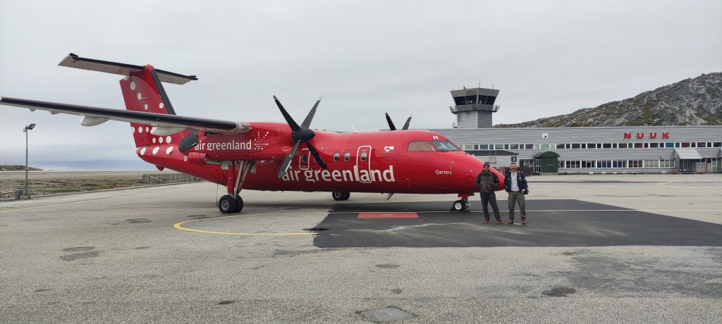 Highlight-ul dimineții a fost însă întâlnirea unui compatriot care, auzindu-ne că vorbim românește, a venit la masa noastră și s-a prezentat. Pe scurt, Liviu, plecat de zeci de ani în Danemarca (și vorbind limba), era între două avioane (al doilea plecând mâine din Nuuk), în drum către noul assignment pe coasta de est a Groenlandei. Profesor fiind (mate -fizică), își trimisese înainte containerul (deci nu sacoșa sau dubița), care avea să îl țină în viață până anul viitor in iunie când apele se vor fi dezghțat și localitatea va putea fi aprovizionată din nou. Întâmplator și noi mergeam a doua zi pe același aeroport, din fericire însă fără container, urmând să facem un stop de cca 1h doar pentru alimentare.