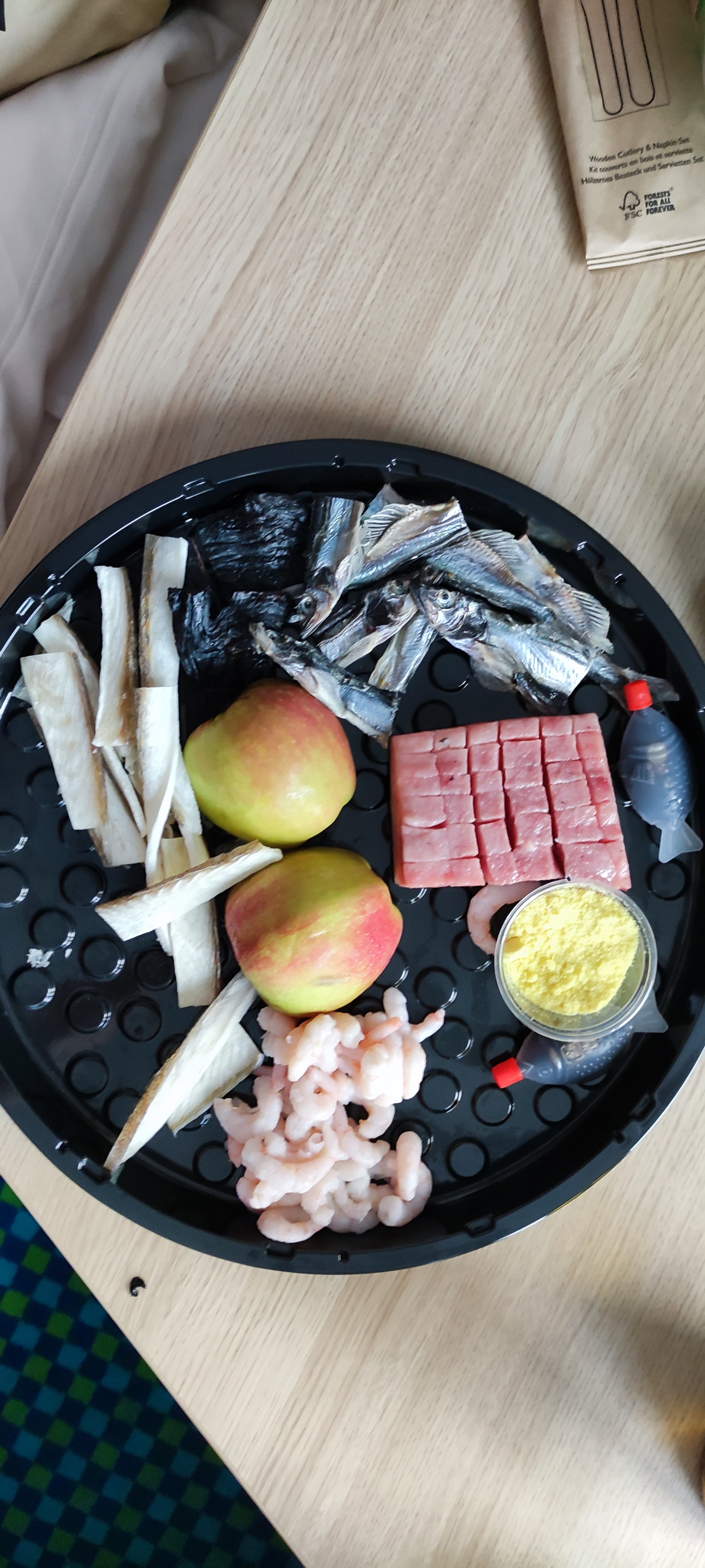 Seara s-a încheiat cu o tură într-un supermarket groenlandez de unde am cumpărat ceea părea a fi o shaorma groenlandeză: un platou de bucăți de pește, care avea și doua jumatăți de măr în el, echivalentul probabil al roșiilor din Iqualit, astfel o bună definiție locală a lui “cu de toate”!