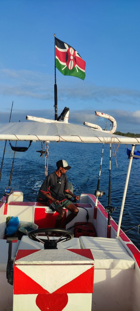 La 7 dimineața am plecat pe mare și după prima oră care a trecut extraordinar de liniștit și repede, noi ieșind în larg și întinzând undițele (”noi” însemnând căpitanul Ali exclusiv), am fost lovit de inspirație: ”Deep sea fishing” înseamnă un mulinat continuu, în care momeala (în cazul de față niste pești de tablă cu cârlige pe ei și niște mici caracatițe de plastic) trebuie să meargă prin apă cu oarece viteză, ca să o observe răpitorul flămând și să o înghită. Cu alte cuvinte, ne vom învârti preț de cca 5h cu barca prin larg (la cam 10-12 km de mal), doar, doar… După 3h s-a întâmplat să muște în sfârșit, iar modul cum un pește oceanic mușcă momeala nu o să îl uit prea curând…s-a auzit ca și cum cineva a mușcat și rupt capul undiței, bambinele fiind astfel un obiect inutil și, corespunzător deci, necunoscut în Kenya.