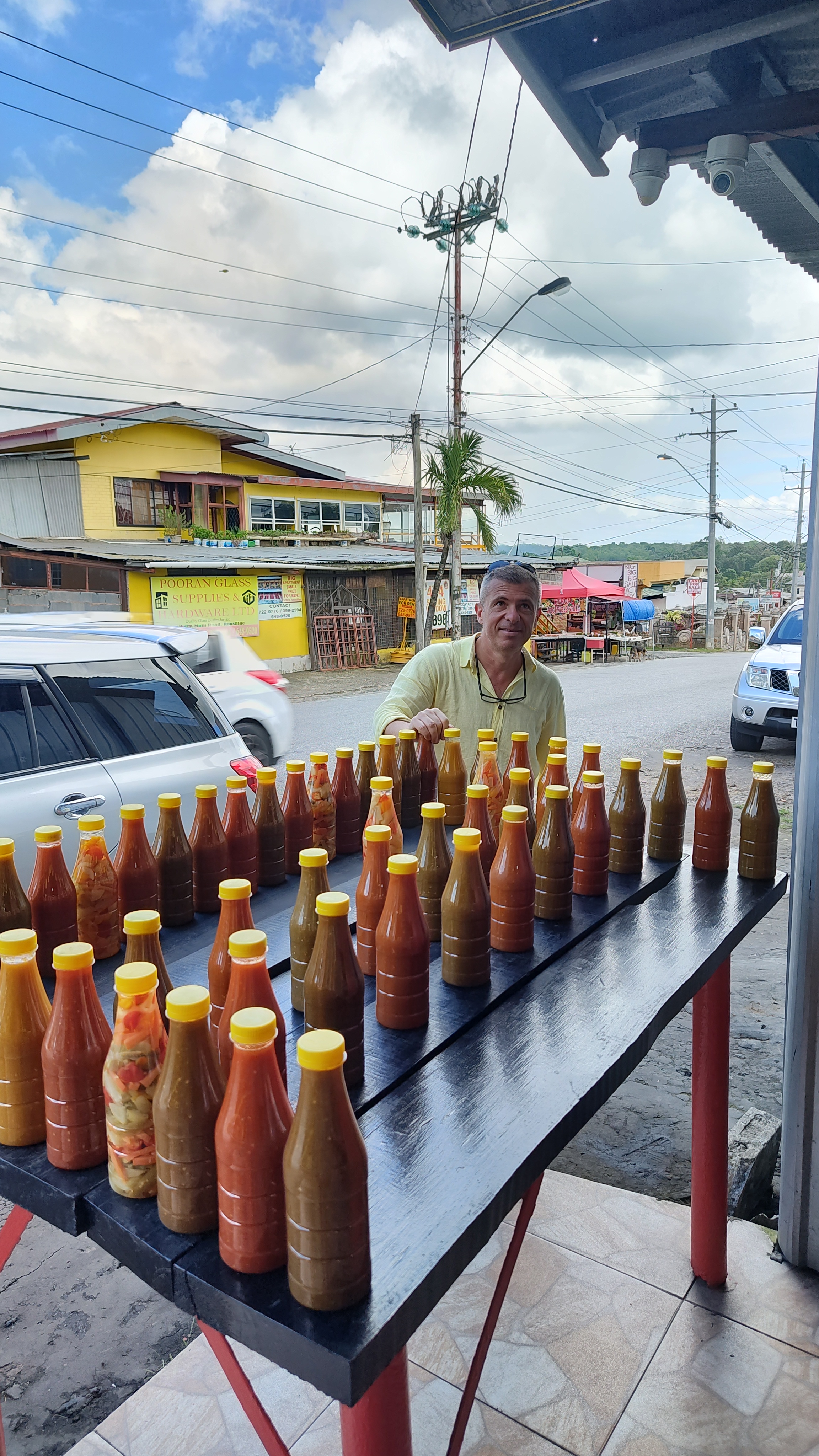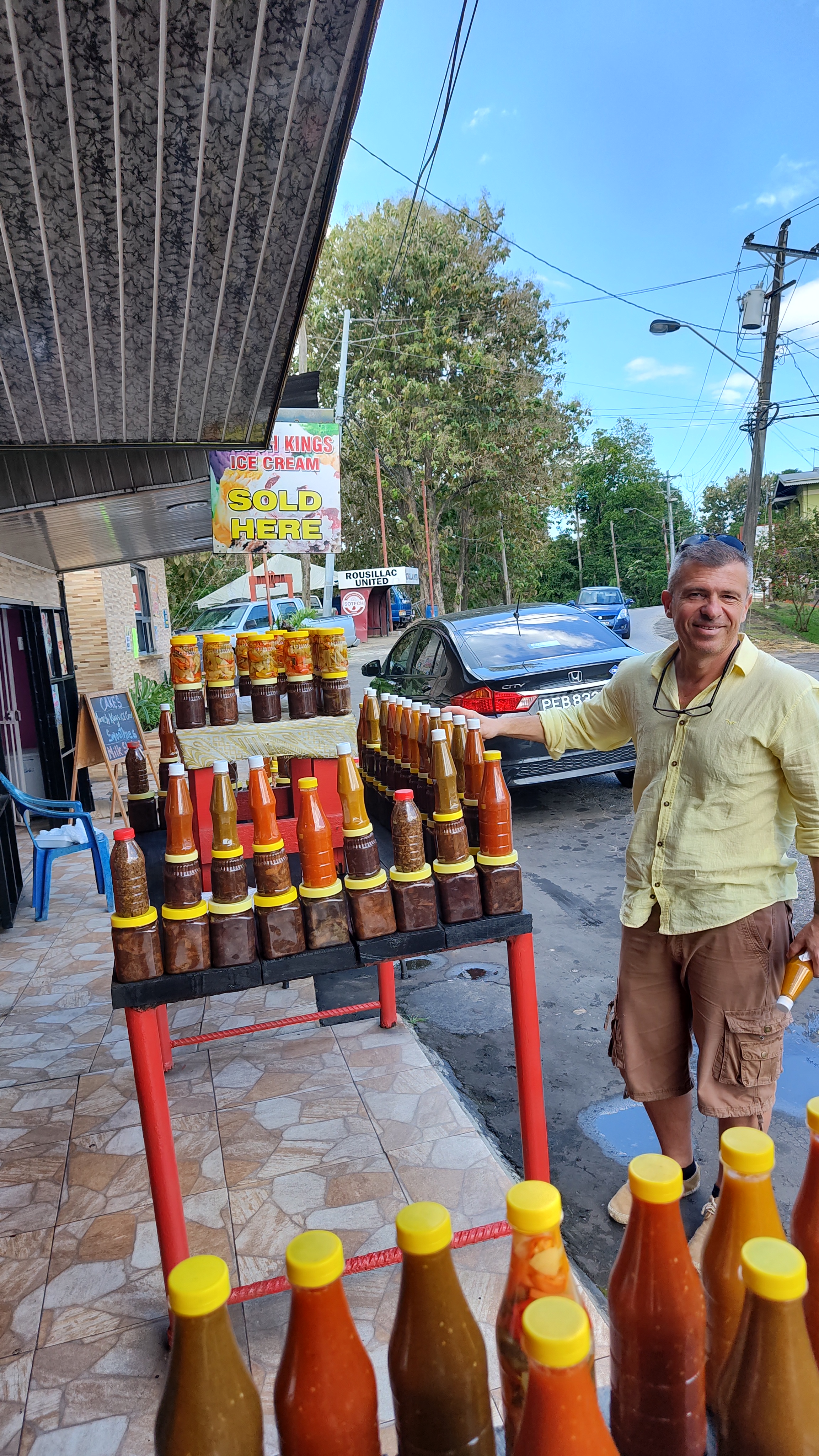 La sosuri a fost mai simplu. Am refuzat cu fermitate ketch-up-ul și sosul de usturoi, cerând sosul local picant. N-avea! N-am venit în Caraibe să mănânc pui cu ketch-up, refuzul meu fiind menținut cu mândrie. Tot învârtindu-mă însă prin jur, ce să vezi? Lipit de magazin era o altă dugheană care vindea …sosuri locale.