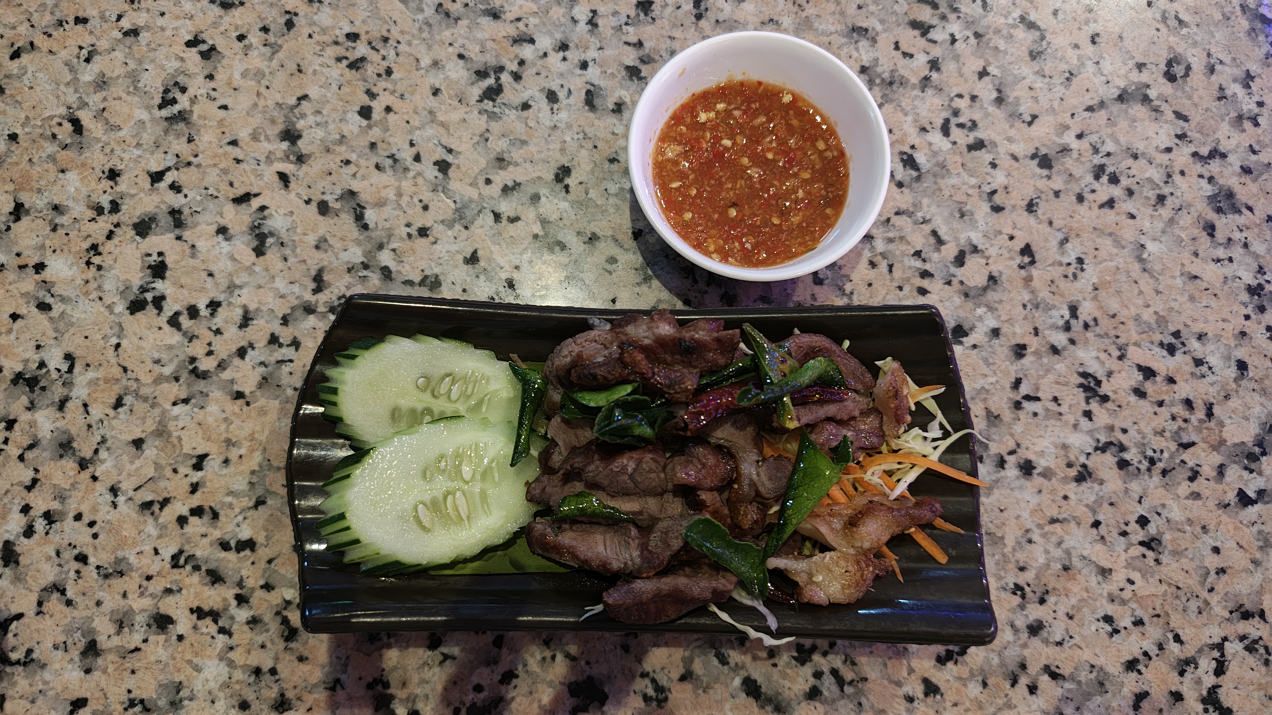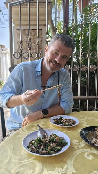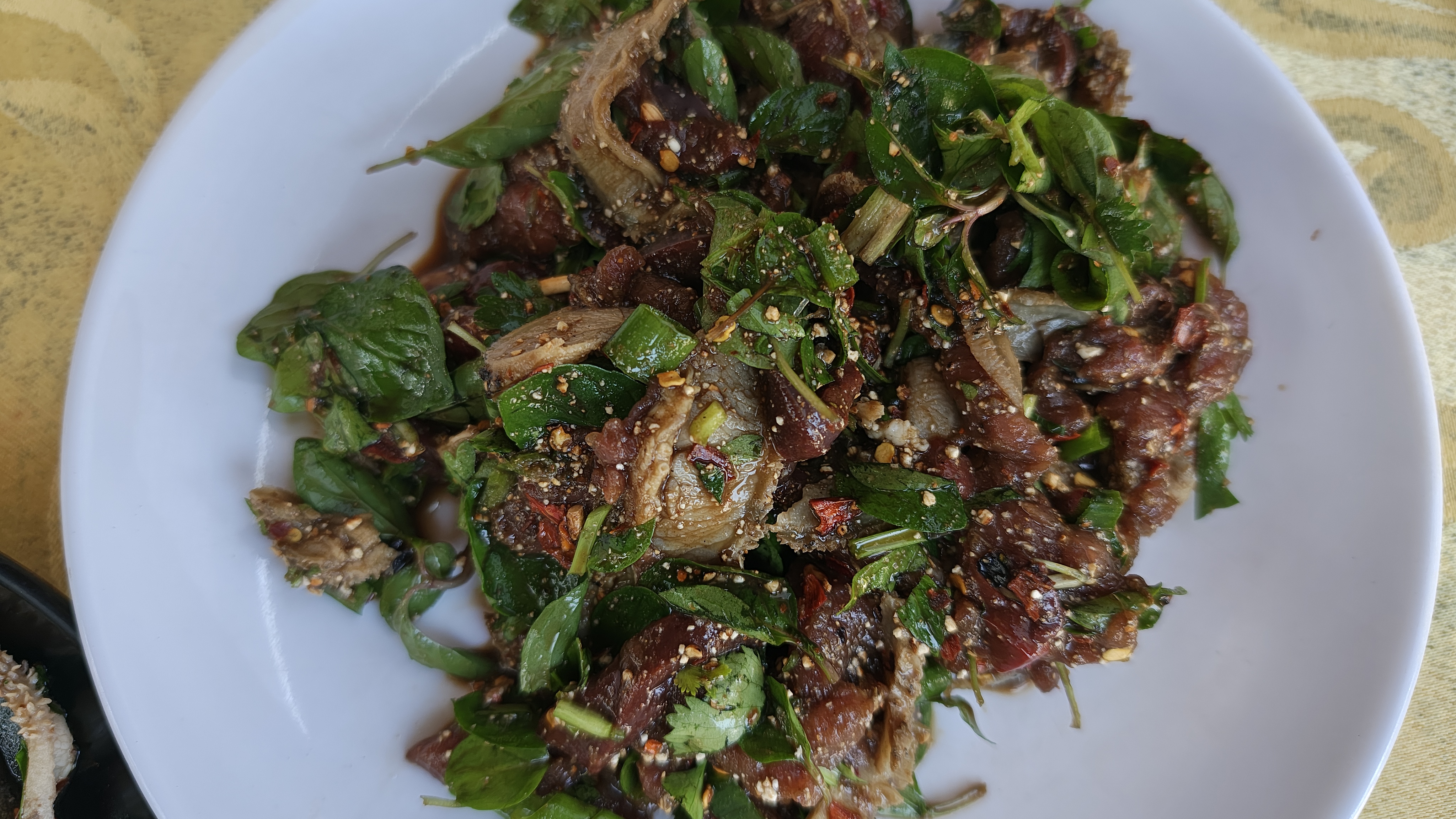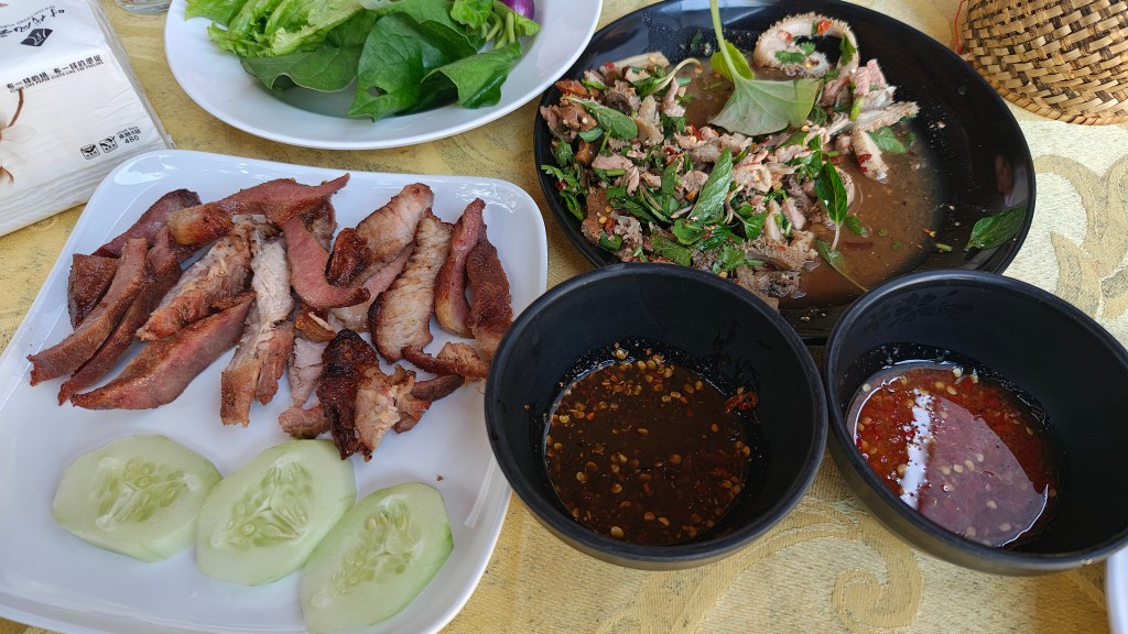 Asemănarea cu Franța nu se oprește aici, în bucătărie (”cuisine” mai exact) laoțienii fiind la fel de entuziaști pentru carnea crudă (de vită) precum fanii biftec tartar-ului franțuzesc. Biftec tartar care se pare totuși că a venit din Belgia, deci tot parte a cuisine francaise, belgienii neavând decât waffels. În cazul laoțienilor însă, vita e tăiată fâșii, mirodeniile sunt puternice au aromă de Asia, iar felul – „laab” – se mănâncă odată sau de două ori pe an, fiind unul mai degrabă ceremonial. Fiind prima oară în Viențiane mi-am zis că mă încadrez în cadrul ceremonial cuvenit, așa că l-am încercat.