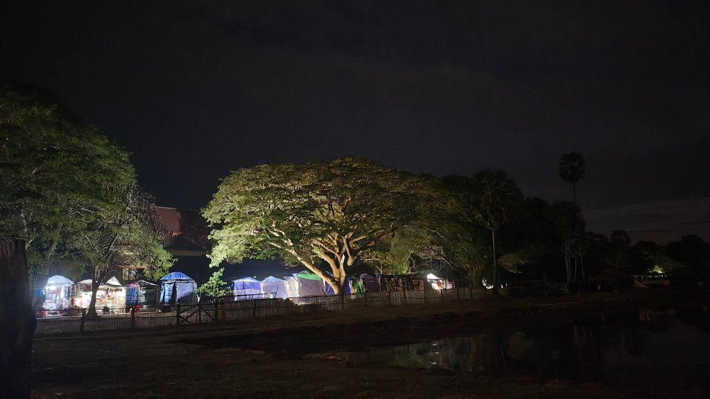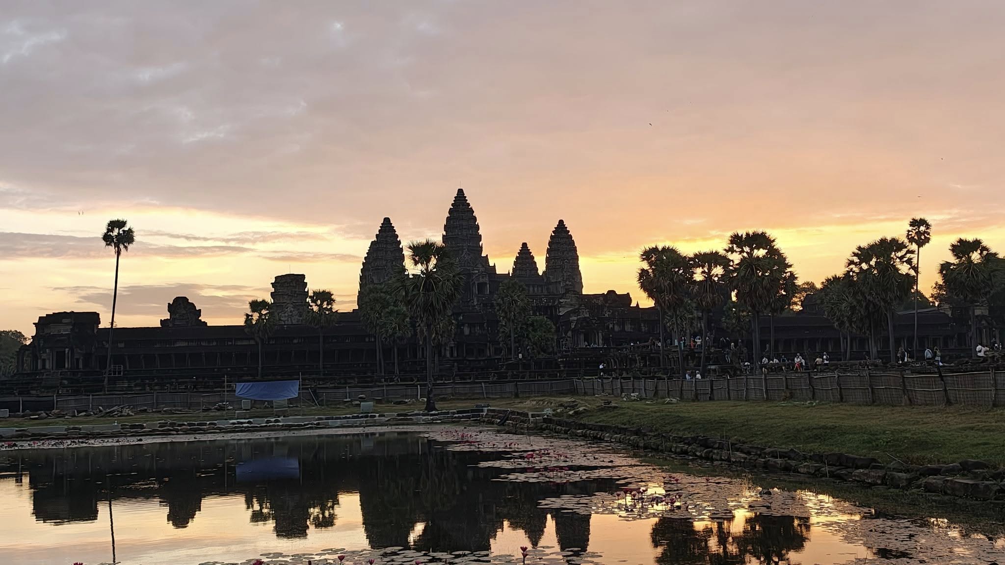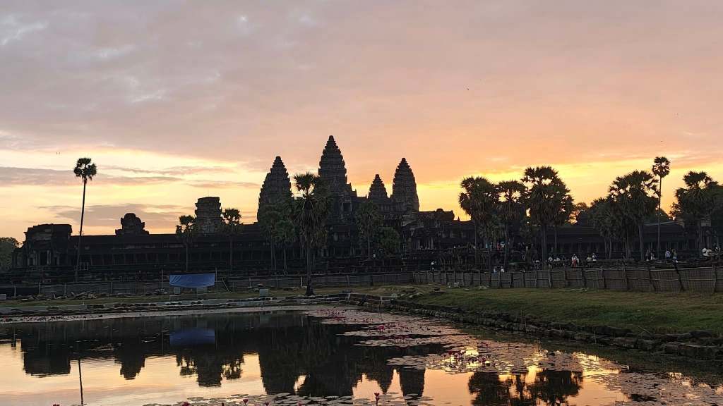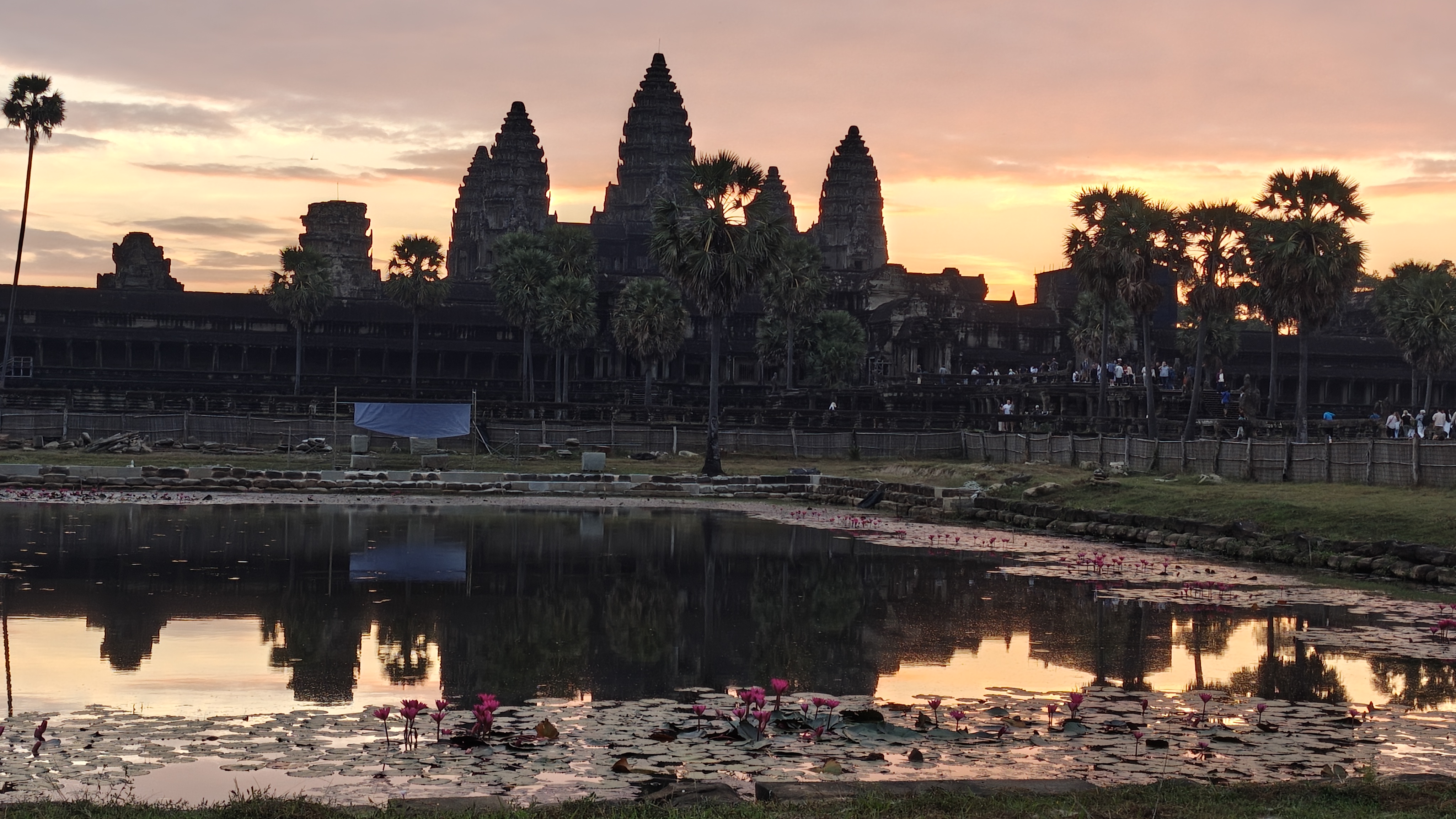Iar norocul meu nu se terminase. Odată completat grupul am descoperit cu bucurie că eram nu numai punctuali dar și foarte disciplinați. Toată lumea, dar absolut toată lumea, își cumpărase bilet online. Ceea ce a făcut ca jumătatea de oră inclusă ca rezervă în program de ghid, pentru a achiziționa bilete ”fizice” pentru turiștii mai amețiți, să nu mai fie necesară. Norocoșii de noi, care am sărit peste 30 de minute de somn pentru a sta atârnați de gardurile de lângă Angkot Wat, așteptând răsăritul cam o oră înainte ca acesta să vină propriu-zis. Bonus însă, am avut locurile ”din față” lângă unul din lacurile templului de unde se urmărește răsăritul. Pentru o oră de somn însă, parcă aș fi stat in rândul 2, 1 metru mai în spate