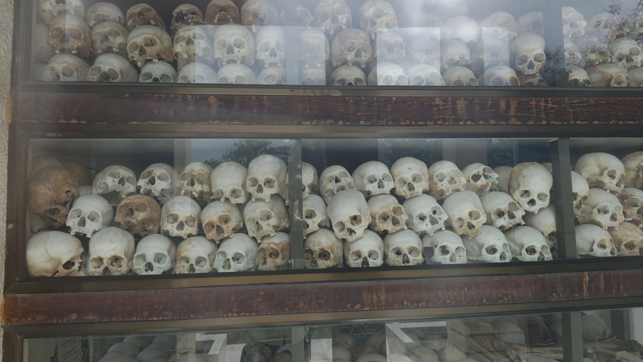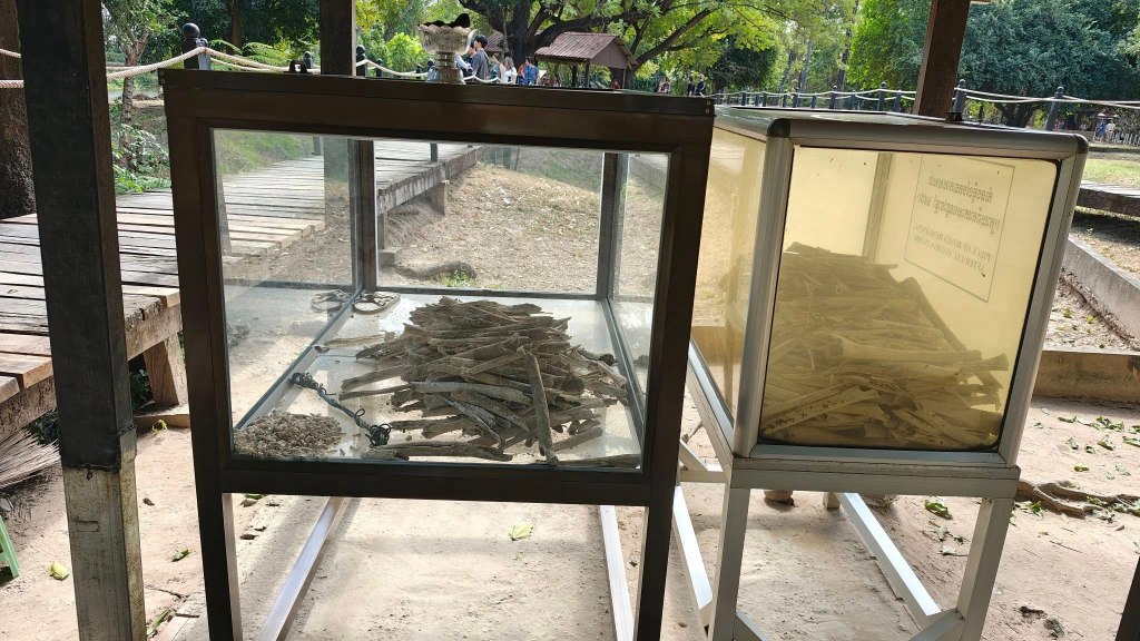 În primul ești întâmpinat de un monument în stil cambodgian în care sunt adăpostite, dar perfect vizibile, câteva mii de cranii. Ale victimelor din acei ani. Practic sunt expuse, mai mult decât adăpostite. Separat și ordonat aranjate în locații dedicate sunt si oasele victimelor, grupate în 4 categorii, lungi, scurte, plate și neregulate, fapt ce dă un aer ordonat locului. Da, tot ce vezi acolo nu este recuzită de film, ci oameni care au trăit, au visat, au sperat, a disperat și au murit acolo…