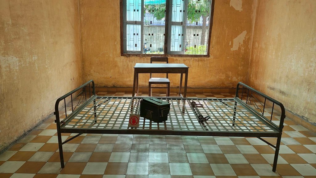 Aici, în fosta șcală din Phnom Penh, parcă realitatea e mai cruntă, deși nu sunt oase sau zdrențe de haine împrăștiate pe jos. În fostele săli de clasă transformate în săli de interogatoriu, era parcă recreată o scenă de film. Exact ca în filmele vechi rusești când comisarii albi (deși noi știm că și roșii făceau la fel), stăteau la o masă mică pe un scaun și cu ochelarii rotunzi pe ochi consemnau conștiincios răspunsurile primite de la dușmanii poporului la întrebările pe care le adresau pentru a-i demasca. Doar că în cazul cambodgian dușmanul poporului nu stătea la masă pe un scaun de cealaltă parte, ci întins pe pat și legat de el cu lanțuri. Singurul obiect pe care suspectul îl avea cu el, era o cutie de metal, cam 30 cm lungime 15 cm înălțime și 10 cm adâncime care servea pentru tot. În ea primea apa și mâncarea, atâta câtă era și trebuia să o folosească pe post de recipient de toaletă, neavând voie sa murdărească celulele. Da, am întrebat de două ori ca să fiu sigur că am înțeles bine. Când nu erau interogați, prizonierii stăteau în celule făcute în alte sali de clasă, în care se compartimentaseră din cărămidă câte 11 celule pe clasă. Fiecare avea cam 1.80 m lungime și cam 60 cm lățime. Practic cât să încapă un om culcat. Sigur, în celulă nu exista decât podeaua și cutia de care am pomenit. Podea care și astăzi are pe ea urme de sânge!